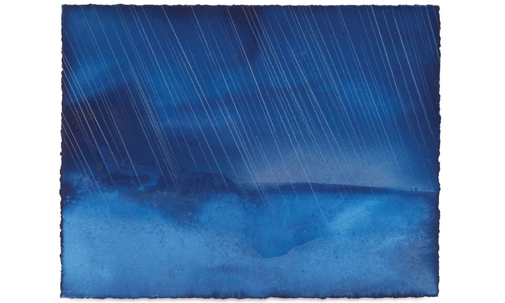 This focus animates her latest work, “Water of the Sky.” The book is a stunning bilingual compendium of 2,000 Japanese words for rain along with their English interpretations, all of which capture “the breadth and diversity of rain’s many expressions,” Ando writes: “When it falls, how it falls, and how its observer might be transformed physically or emotionally by its presence.” Accompanying the text are 100 of her indigo drawings — rendered in pencil and micronized pure silver — each offering a visual display of rain’s varied forms.