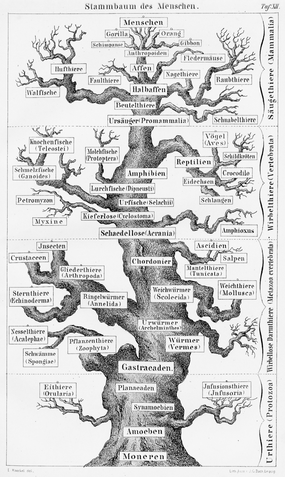 Ernst Haeckel, ­“Family Tree of Man.” Tree pictograms laid out and justified evolutionary, human-centered hierarchies based on race and nationality. In the English edition, this image was titled “Pedigree of Man.” Source: Ernst Haeckel, “Anthropogenie oder Entwickelungsgeschichte des Menschen” (Engelmann, 1874), ­Table 12. Deutsches Museum Library.