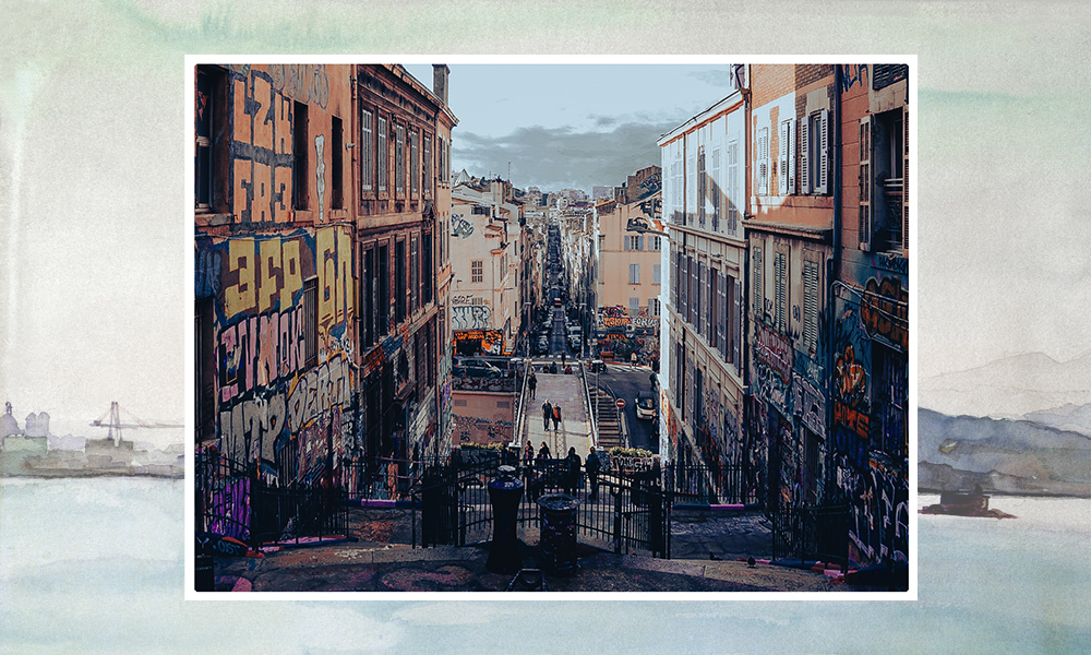 The usual exit to the left of the newsstand in the city’s main Saint-Charles station takes the traveler out onto the grand theatrical steps leading down towards the center of Marseille. Standing at the top of the steps, surprised to be out of the dim light of the station, most visitors pause for a moment to take in a view of the city. The view stretches down the steps, across the statues of women representing the former colonies of Asia and Africa, then along the boulevard d’Athènes, with its dilapidated 19th-century houses, across la Canebière, across the bourgeois houses of the 6th district to the hills and to the sky beyond. Up to the right, on the hill, is the church of Notre-Dame de la Garde, also known as la Bonne Mère. Women all: Asian, African, the good French mother. There are usually some people standing here, at the top of the steps, waiting for a moment, a little hesitant, about to step down into the city, or perhaps about to turn away and leave.
