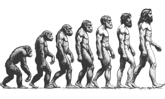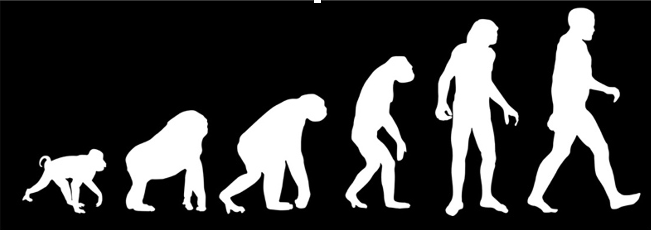 Figure 2A: The most ubiquitous and useless image used to explain evolution. It gives the impression to many that we transformed from a monkey, then a chimp, and a “caveman” in a direct series leading to “modern man.” In reality, we share a common ancestry with these other forms, and we did not progress from them but rather with them from those shared ancestors. This image has done far more harm than good to those trying to explain evolution. These depictions are based on the original “March of Progress/Road to Homo sapiens” by muralist Rudolph Franz Zallinger.