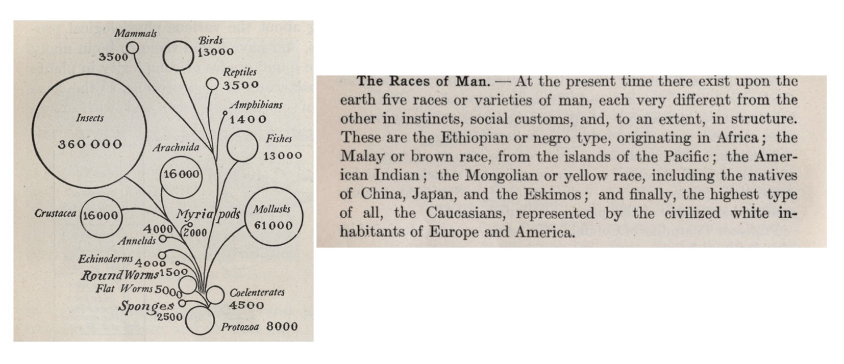 Figure 1: The left image from “Hunter’s Civic Biology Textbook” shows an “evolutionary tree” in the “The Doctrine of Evolution” section. It depicts a “simple” to “complex” progressive view of evolution from bottom to top. This notion is emphasized in the right image, a text from the book’s “Races of Man” section that explains a hierarchical view of human races.