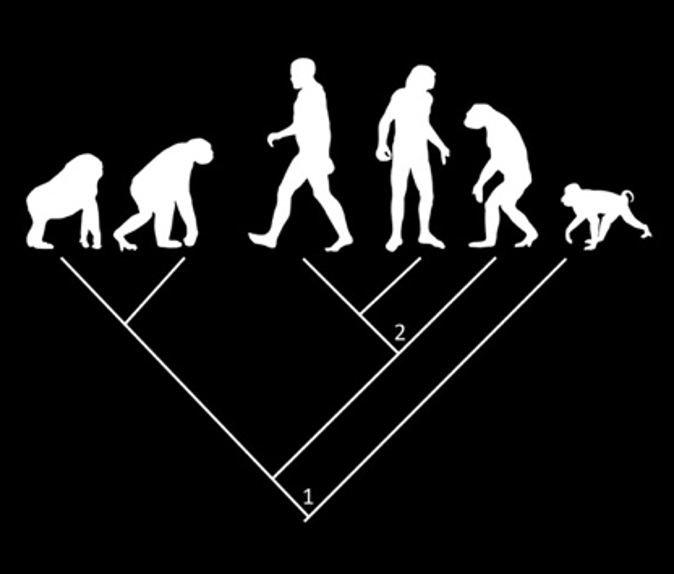 Figure 2B: A more accurate way of depicting evolution is with a phylogenetic tree. The branches bifurcate (split in two), and pairs that share a “node” (the point where the split connects) are more closely related to each other. Here, the tailed monkey is the closest relative to the five other primates, not the “ancestor.” The ancestors are represented in the nodes. Node “1” is the common ancestor of the six primates (including humans) depicted above. Node “2” is the common ancestor of chimps, modern humans, and extinct human species.
